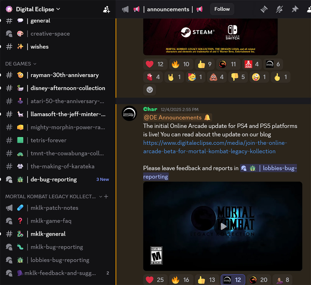 We'd like to give a special thank-you to all the players who have joined us on the Digital Eclipse Discord server – the best place to share your feedback reports with us!